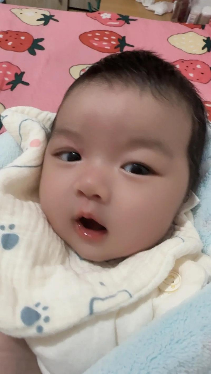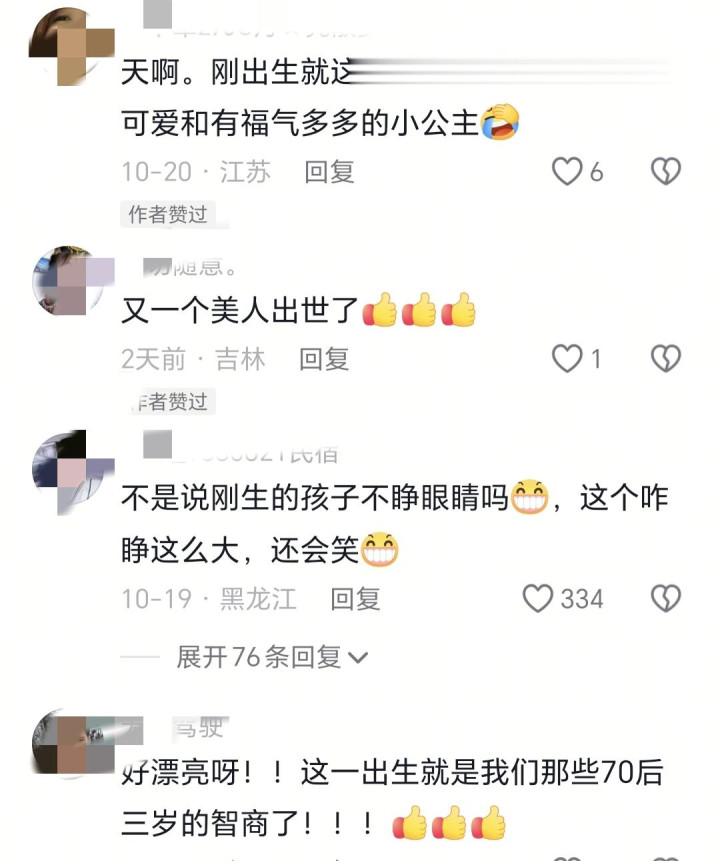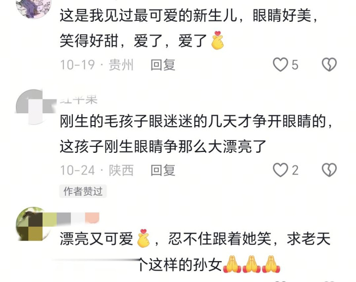 一个陕西的网友说:刚出生的毛孩子眼眯着的,几天才睁开眼睛,这孩子刚生眼睛睁得这么大了,太漂亮了。